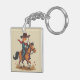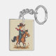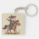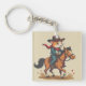 Brown tan and white Guinea pig riding a brown horse like a cowboy. Guinea pig is wearing a cowboy hat.