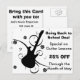 Få in fler kunder med det här "gitarlektionsuppgörelsen". Byt text, så lägger vi bara till exempeltext. Ändra texten till dina behov på kortets framsida och baksida i anpassningsområdet. Ett underbart sätt att annonsera affärsverksamhet och påminna dina kunder om att anmäla sig för gitarlektioner med dig!