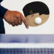 Cool tan wood and black guitar silhouette ping pong paddle. Personalize the name and monogram initial. Great gift for music lovers.