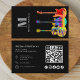 Guitar-musiker från musiker QR-affärskort och social-mediemall med enkel använda för kontaktinformation, QR-kod för webbplats och social-medieikoner perfekt för företagsnätverk. Psykedeliskt akustiskt gitarr, semakustiskt gitarr och elektriskt gitarr ljusa färger på en svart bakgrund kompletterat med personlig monogram. Coola modern musiker affärskort design för gitarrer, professionell musiker, underhållare och musiklärare. Originalkonstverk av konstnären Catherine Sweetman