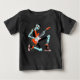En robotfigur spelar en elgitarr när han bär en svart jacka, smygare och gitarren som är direkt kopplad till hans huvud. Ljusa färger högdager gitarren och skorna, vilket ger en dynamisk vib.
