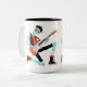 En robotfigur spelar en elgitarr när han bär en svart jacka, smygare och gitarren som är direkt kopplad till hans huvud. Ljusa färger högdager gitarren och skorna, vilket ger en dynamisk vib.