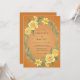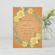 En varm, konstnärlig design med penslade gula rosor och påskliljor arrangerade i en svepande botanisk krans. Frodig grön lövverk kompletterar de mjuka blomsterdetaljerna och skapar en romantisk och eterisk stämning. Den övergripande färgpaletten frammanar en vintage charm, perfekt för ett minnesvärt tillfälle.