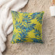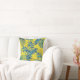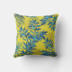 Gul kastkudde med livfulla blå och gröna tropiska bladmotiv på båda sidor, vilket skapar en fräsch och livlig tropisk stämning.