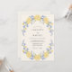 Denna design har en delikat arrangemang av soliga gula rosor och mjuka blå blåklockor. Den akvarellkonstnärliga stilen skapar en romantisk och lugn stämning perfekt för en vårhändelse. Nyanser av salvia grönt bladverk kompletterar de varma blommiga tonerna mot en neutral krämfärgad bakgrund.