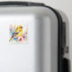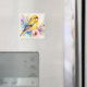 Denna magnet har vattenfärgskonst av en gul sångfågel omgiven av mjuka botaniska blommor i rosa, turkos och lila nyanser.