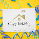 Gul hus med ballonger Grattis på födelsedagen Fast Vykort
