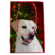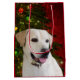 Den gula labrador retrieveren av en julgran tittar framme all stilig hund älskarejul, helgdag somgåvan hänger lös