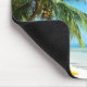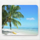 Mousepad av en gul kajak under en hängande palmträd på en vitsandstrand på den tropiska ön av Moorea, nära Tahiti, i den Stillahavs- skärgården franska Polynesia.