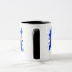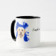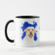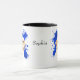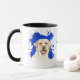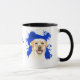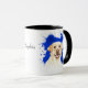 En vacker porträtt vatten färg från en gult Labrador Retriever står ut mot en ljusblå abstrakt stänk stänk bakgrund. Bilden finns på två sidor av mugg, med ditt namn eller annan anpassningsbar i svart mellan dem.