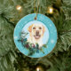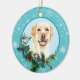 På framsidan av denna Helgdag är ornament ett vackert porträtt i en gult Labrador Retriever-hund som pissar ut från en holly och en evig grön bough. Röda bär och gräs-koner dekorerar huggen och gräs sprickor. Bilden placeras på en blek blå cirkel som ramas av ett retroblått snöflingor mönster. Baksidan av dekorationen har samma bakgrund och cirkel med anpassningsbarnas text i blått.