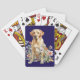 Spelkort med gul lab hund design. En vacker valp finns bland stora vilda blommor på en mörk, marin blå bakgrund.