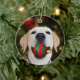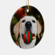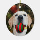 Unga gultens labrador håller en julprydnad i munnen och tror att det är en boll hundälskares helgdag för julprydnad