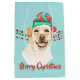 En vacker gult Labrador Retriever-Hund bär en röd och grönt Jultomten som står framför de röda pärlorna och gröntens julklapp på båda sidor om presentsäcken. På grund finns fält i text som matchar röd för din egen text. För närvarande säger den ena sidan "God jul" och den andra sidan "Gott nytt år", men du kan ändra dem om du vill. bilder och text placeras på en ljusare grönt. Se till att se de matchande produkterna i vår butik.