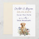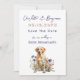 Bröllop spara datum-kort med gul lab design för vilda blommor. Mörk blått text med namn först i handskript. Datumet är numeriskt i tan med mörk blått skugga. Inkludera även ort och stat. En gult Labrador-hämtare sitter i vilda blommor i designen vid grund. Perfekt för ett par, inklusive deras hund i bröllop.