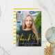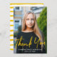 Modern studenten tackar dig för att du har ett kort med studenten med "Tack" i gultens penselskript. Anpassa framsidan av fotot, tack vare att du lagt till student namn och studenten. Kortets baksida har plats för ditt skrivna eller handskrivna tackmeddelande med gult och vit strimlad bakgrund.