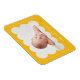 Modern magnet för födelseannonsering med ditt barns foto inuti en ljusgul ram med vågig kant. Anpassa den gula födelseannonseringsmagneten genom att lägga till ditt barns namn och ytterligare information i vit text.