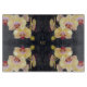 Den ursprungliga konstverket av HomeWare på denna 11"x8" skärbräda gjordes från ett originalfotografi av orkidéblommor. Det är ett närbildsfoto, en detaljerad vy av de ljusgula blomblad som omger djupröda läppar i mitten av blomman. Det finns också en touch av lavendel innan kronbladen blir gula. Bakgrunden till orkidé-mönstret är i nyanser av djupgrått till svart. I mitten av designen finns monogram-text i en ljusgyllene färg. Denna kan anpassas eller raderas om du föredrar det.