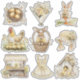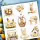 Gul påskuppsättning 2 dekal. © Välj en dekal. Detta ark med påskdekaler i gula toner innehåller ägg, höna och kycklingar, kaniner, en blomställning, en förkläde och blommor.