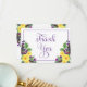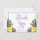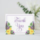 Boho floral bouquet "Tack"-design med gula rosor och lila violetter, och det är grunden för denna överlappande flordesign med lila skripttext.