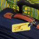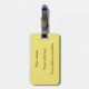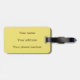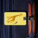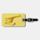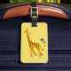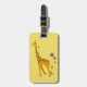Gullig märkre för giraffpersonligbagage med en rolig tecknadgiraff som knaprar på en purpurfärgat blomma och innehav några blommor med dess svanstundrulle som åker skridskor, på gul bakgrund.