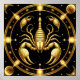 En detaljerad illustration med en gyllene skorpion, som symboliserar stjärntecknet Skorpionen, omgiven av intrikata astrologiska motiv och en stjärnbeströdd natthimmel, som utstrålar elegans och kosmisk mystik.