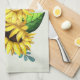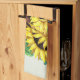 Köks handduk med en vacker blomsterbukett - glada gula solrosor och gröna blad. Fräscht och roligt.