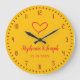 Personlig vigsel eller årsdag gåva idé: en minimal och charmig personlig gul väggklocka. Designen inkluderar parets namn och bröllopsdatum. Klockan är dekorerad med en enkel hjärtegransk illustration som en symbol för kärlek.