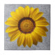 Gula blommor, grått-stenmurens struktur bakgrund på keramiskt plattor.
