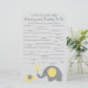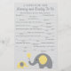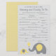 Använd våra gula och grå elefant-tema bebis dusch tips kort för ett roligt och unikt sätt att lämna deras råd och önskningar. Kortet har fraser som "Se till att alltid ha ___________ i blöjan" och för att vara säker på att "_____________ bebisen varje dag."