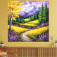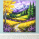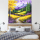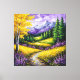 Majestätisk landsbygdsscen med livfulla gula fält, frodiga träd, färgglada blommor och majestätiska berg under en lila himmel. Representerar naturens harmoni och landskapets livfulla färger.