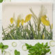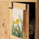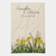 En teatowel med ett foto av gult- och vitirisbucharicaen med gröntlöv på en kräm- bakgrund, med textmallar som ska fyllas in med brud- & brudgumnamn och som dateras av händelse, för en möhippa-, bröllop- eller årsdaggåva. Matcha bröllopbrevpapper med den samma tillgängliga designen.