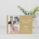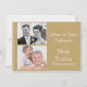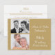 Denna 50-års bröllopsinbjudan har en guldfärgad bakgrund och en fin spetsliknande dekoration på sidorna samt två områden för parets foton. Baksidan är vit med en guldfin spetsliknande dekoration. Den är redo att anpassas och är lämplig för en gyllene 50-års bröllopsdag.