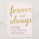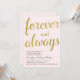 En glamourös bröllopsjubileumsinbjudan med frasen "För evigt och alltid" skriven i ett vackert kalligrafiskrift med en falsk guldprägling och en ljusrosa bakgrund. Texten kan anpassas för alla jubileer.