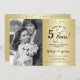 5-års bröllopsdag inbjudan med foto. Elegant design i guld med skrivstil och konfetti. Kan anpassas för att visa alla år av äktenskap. Skål för 5 år!