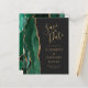 Det moderna bröllop spara datum-kortet från elegantens lämnat kant har en framväxande grönt vattenfärgsagat gräns som trimmas med faux guld glitter. Anpassadet kombinerar handskrift, rityta och kursivt typsnitt med guld-färgad på en svart bakgrund. Den omvända sidan har en matchande framväxande grönt och guld agate-design.