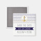 Guld, sjöankare och sjömagnet rand bröllop spara datum. Den här eleganten och den moderna utformningen av ett bröllop på stranden har vågrät rand i marinblått och guld som täcker överdelen av kortet och ett ankare i guld glitter i en vit cirkel med guld kontur.