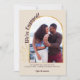 Anpassningsbarnas meddelande om fotoförlovning. Fotomallen har konfigurerats så att du kan lägga till ett eget foto, som är inramat i en guld-båge med skissad bra. "Vi är förlovade" är skrivet i fet, bågformig typografi. Återstoden av ordalydelsen är helt redigerbar och lyder för närvarande: "Vi har inte angett något datum än, men kunde inte vänta med att ut nyheter med dig [ditt namn]", som du kan anpassa som du vill. En chic, modern design för att dina nyheter innan du kommer runt för att organisera ett party eller ställa in datumet för bröllop.