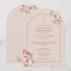 Vackra blomsterliknande pampasgräs akvareller med en chic guld båge ramar in dina första kommuniondetaljer i stilfull guldsats på en mjuk rosa bakgrund. Designad av Thisisnotme©
