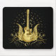 Presenterar den musikaliska designen för fantasistil en guld- bevingad gitarr med scolling brytningar och musik noter.