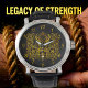En slående illustration har en guld-bison med framstående horn, som ställs mot en bakgrund av detaljerade blommigtar.