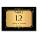 Elegant bröllop-bordsnummer-kort i guld och svart med festliga konfektgnistor.