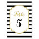 Kort för bordsnummer av elegant och chic i klassiskt svart och vitt rand mönster med uppgifter om vintagen i guld. Anpassa korten med bordsnumren för ett speciellt tillägg till borden i bröllop. Lämpligt även för födelsedagar och årsdagar i party.