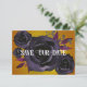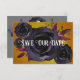 Vacker svart lila ro med lila blad dekorerar elegantens moderna gotiska Spara vårt datumkort. Baksidan är ett grått med vit traditionell text som läggs till med ett svart ro i mitten som ram på ditt foto. Gå in i ett område där Gothic inslag går in i jorden med modern estetik i vår Black Gothic bröllop Spara vår Date. Ett firande av kärlek och mörker väntar, där andar dansar under månljuset och kärlek inte känner några gränser.