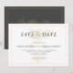Enkel elegant spara datum bröllopsinbjudan med guldtoner blomsterbukett som en guldvattenstämpel.