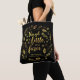 Denna svart all över - trycktotot hänger lös särdrag citationstecknet från Williams Shakespeare Midsummernatts dröm ", fast hon är men lite, henne är våldsamt" som omges av blommor, och löv i fauxguld omkullkastar.
