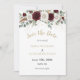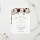 Meddela din kommande bröllopsdag med detta fantastiska "spara datum"-kort som har samma vackra blomdesign i guld, vinrött och rosenskiftande färger som din bröllopsinbjudan. Framsidan visar en elegant komposition av djupt vinröda och mjuka rosaskiftande rosor med diskret grönska och inslag av pampasgräs, medan baksidan visar parets favoritfoto med en stilren ram-effekt. Denna sammanhängande design säkerställer att din bröllopspapper berättar en enhetlig historia från det allra första tillkännagivandet. Det romantiska botaniska temat och den sofistikerade färgpaletten skapar det perfekta första intrycket för din speciella dag och sätter tonen för en elegant firande av er kärlek.