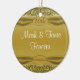 Ursnygg och sofistikerad guld- scrollwork på en guld- bakgrund och med ett band för fauxsatängfullföljande som överträffas med en guld- juvelnågot liknandemonogram, knäppas med ord "den 50th årsdagen". Precis i tid för din guldbröllopårsdag!