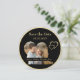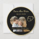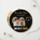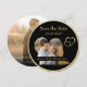 Meddela din bröllop med en elegant, guld, modern cirkel bröllops klara datum som har ett foto i form av en brud och brudgum silhuett på framsidan och ett annat helsidesfoto på baksidan. Med elegant guld typsnitt. Lätt att anpassa. All text och bakgrundsfärger är redigerbara. Om du behöver hjälp med designen eller matchande produkter, vänligen maila Brandi@photobooksbybrandi.com