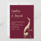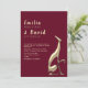 Denna guld- och burgunderfärgade bröllopsinbjudan har en slank, modern silhuett av ett abstrakt skulpturpar - perfekt för stilfulla, konstnärliga eller moderna bröllop. Den minimalistiska layouten framhäver parets namn med elegant skrivstil, mot en rik burgunderbakgrund för en romantisk och lyxig ton. Idealiskt för formella bröllop under våren, hösten eller vintern.